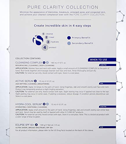 Minimize the appearance of blemishes, breakouts, enlarged pores and congested skin, and achieve your clearest complexion ever with the PURE CLARITY COLLECTION. Collection Contains: CLEANSING COMPLEX 180 mL ℮ 6 fl. oz. ACTIVE SERUM 15 mL ℮ 0.5 fl. oz. HYDRA-COOL SERUM 15 mL ℮ 0.5 fl. oz. ECLIPSE SPF 50+ 100 g ℮ 3.5 oz.