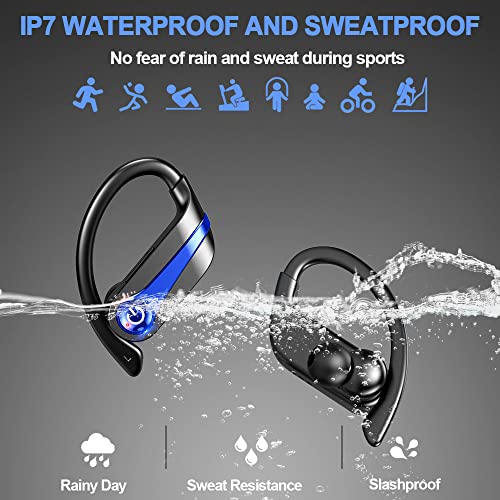 - IP-X7 Waterproof and One Button Control: Sport headphones are designed with IP-X7 waterproof nano-coating, running headphones are strong enough to resist all the penetration from splash and water. Ideal for sweating it out at the gym. Each sport earbud has function of answer/reject phone, volume adjustment, switch music,voice assisatant. Free your hands completely when you’re busy doing exercise, bicycling, driving or running.